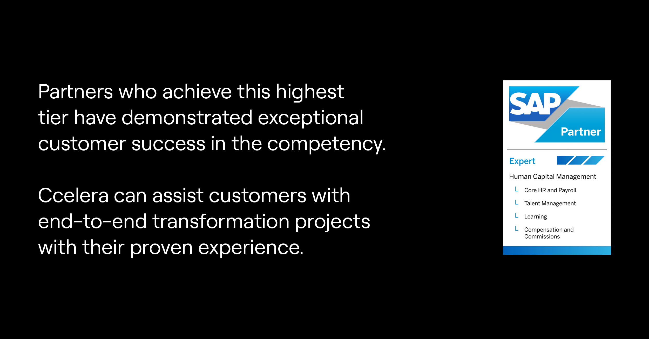 Ccelera is now recognized as an “Expert” on the HCM competency for having obtained the highest level, required by SAP, on certifications and projects in each of the four necessary specializations.