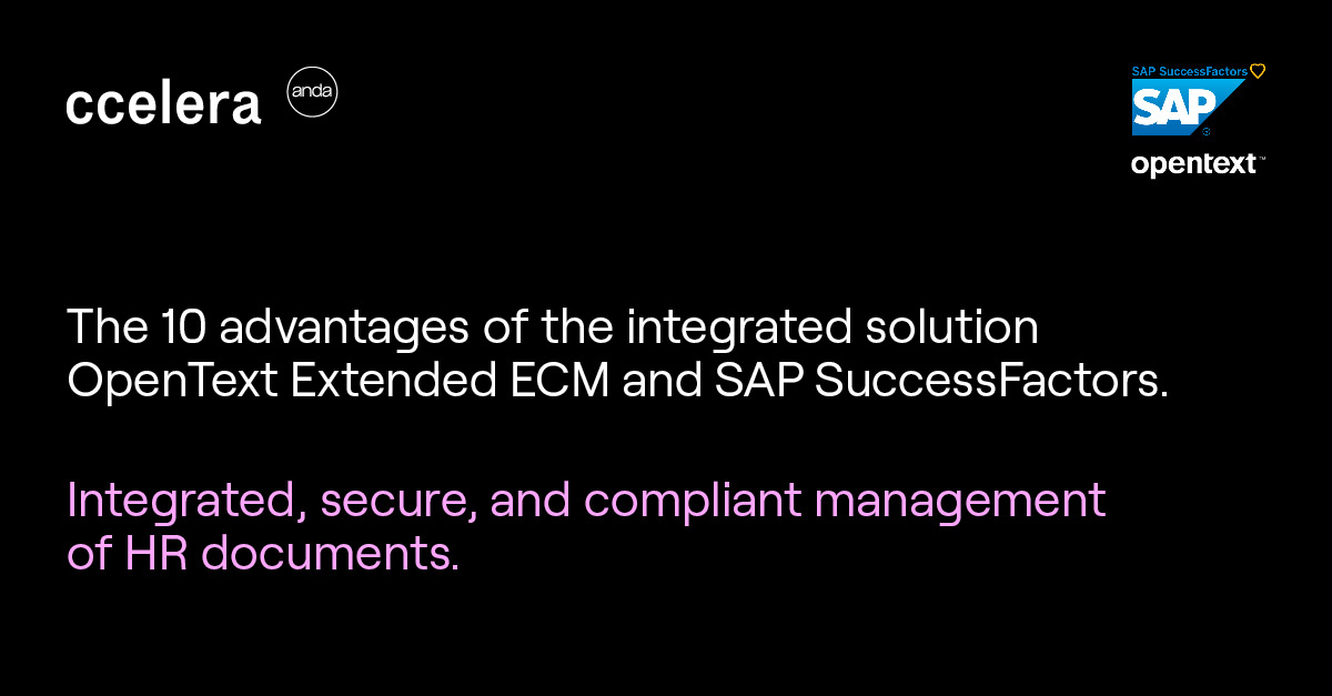 Ccelera is the OpenText Silver Partner and SAP SucessFactors HCM solution expert that supports companies in implementing Extended ECM and SAP SuccessFactors, helping to improve efficiency levels in HR document management.